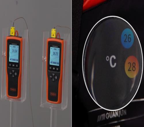 在实验中,由模特穿着安踏冠军滑雪服,站在-20℃的环境中待着10分钟,滑雪服内置的温度计显示温度变化并不大,服装内微环境的温度最终保持在26-28℃。