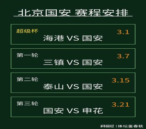而新赛季联赛赛程也陆续在网上传开,看完前三轮对阵的形势,不少球迷第一反应是强度真不低。3月7日,国安在客场对阵武汉三镇,3月15日再到客场挑战山东泰山,3月21日回到主场迎战上海申花。再算上超级杯面对海港,新赛季的前四场比赛就是硬仗。